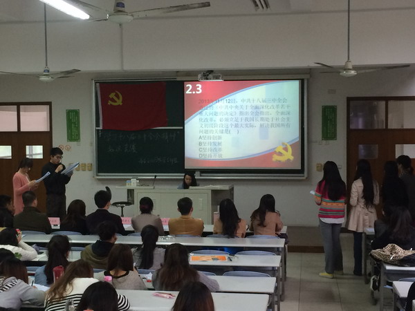 2014年4月21日,语言文化学院学习“十八届三中全会精神”知识竞赛在日阶203顺利开展。语言文化学院党总支书孙叶青、学保处处长助理兼语言文化学院党总支副书记周建文、学院党总支副书记蔡勇永、学生党建中心常务主任翁晓玲、分团委书记杨央、英语专业党支部书记杨燕玲、德语专业党支部书记曹占侠、汉语言文学专业支部书记刘庆奇出席了本次活动,并担任了比赛的评委。 学生党建中心常务主任翁晓玲致开幕词。随后,主持人介绍了来自德语、英语、汉语国际教育、汉语言文学、日语专业的五支参赛队伍。比赛过程中,五支队伍经过了必答题、抢答题以及论述题三个环节,最终,汉语国际教育专业组获得了最佳团体奖。最后周建文老师致闭幕词,为知识竞赛画上了完美的句点。 本次活动受到了语言文化学院的全体党员和入党积极分子积极响应。举办此次学习“十八届三中全会精神”知识竞赛旨在增强同学们对党的理解,提高同学们对“十八届三中全会精神”的认识,同时也提高了同学们的团队合作能力与集体凝聚力。(语言文化学院) | | |