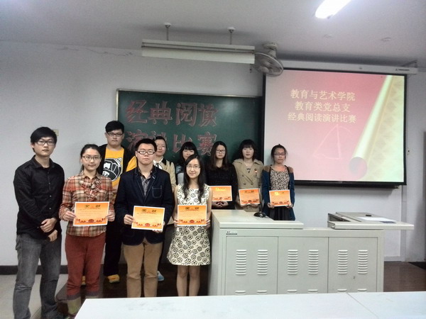 4月23日下午16点15分,正值第19个“世界读书日”,教育与艺术学院教育类专业党总支在日华楼121,举行了经典阅读演讲比赛,此次比赛由教育系党建中心承办,学院党委书记助理凌琦、学保处副处长刘天翔、教育与艺术学院教育类专业党总支沈晓燕等老师出席比赛并担任评委。教育类专业11―13级各班的团支书和宣传委员及由初赛选拔出的十个班级演讲代表的后援团队参加本次比赛。 经过激烈角逐,来自13艺术教育1班的明星同学,勇夺第一名。随后由凌琦老师以她自身热爱阅读、受益读书的亲身经历鼓励在座师生,为此次演讲比赛画上圆满的句号。最后与座的各位评委老师为获奖同学颁奖,并合影留念。 |