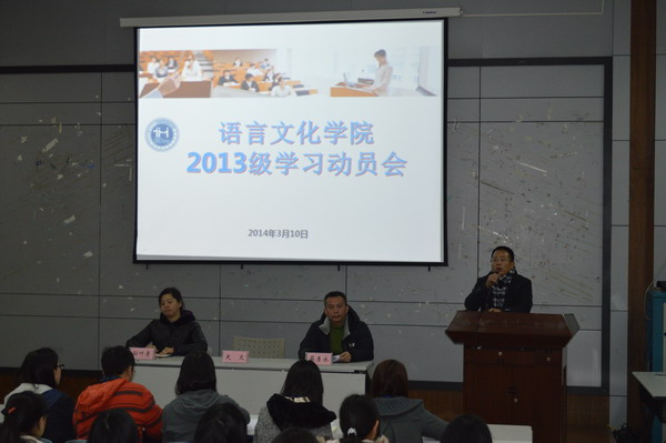 语言文化学院于2014年3月10日召开全体13级学生学习动员会,语言文化学院院长史文、总支书记孙叶青、总支副书记蔡勇永、周建文,以及全体13级辅导员和班助理参加了会议。 在会上,史文院长鼓励语言文化学院的学生看淡和摒弃当下“功名至上”的流行思想,要成为正确价值观的传承人,寻找真实的自我,学做幸福的人,怀有朴实诚挚的心。接着,来自13日语(2)班的梁帆的同学上台分享了他参加头脑奥林匹克竞赛的故事。最后,孙叶青书记则以读大学读什么为题,围绕“学校的文凭、实用的技能、独立的人格和同学的友情”作了总结发言,讲了如何看待大学学习,大学应如何学习的问题。 |