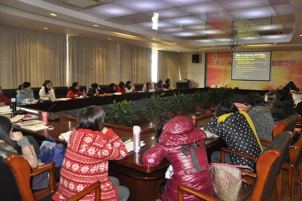 2013年12月27日,语言文化学院英语专业特邀华东师范大学外国语学院张锷副教授来我校作题为“听力教学中如何应对学生的焦虑情绪”的讲座。学校副校长、语言与文化学院院长史文,副院长缪建维,学术分委员会主席张春柏教授,学院办公室主任朱博,英语专业主任邢�以及英语专业全体教师出席了本次讲座。 张锷副教授从前沿理论出发,同时结合自身多年的教学经验,指出了英语听力教学中的难点与重点问题,并与各位老师分享了具体的教学方法和技巧。从讲座中,可以看出张锷副教授是一位深受学生喜爱的老师。她在教学上以学生为本,注重学生的个性和差异性,同时,她又具有很强的责任感,大量收集教学资源,并不断研究和改进教学方法。在互动环节中,老师们纷纷发言提问,和张锷副教授进一步讨论了教学中的困惑。本次讲座得到了英语专业全体教师的一致好评。(语言文化学院) |