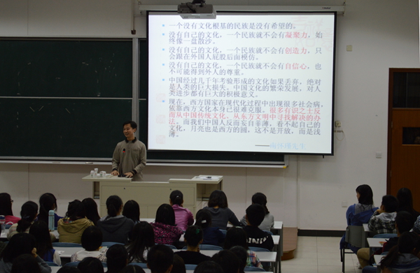 | 2013年10月21日晚18点,语言文化学院特邀华东师范大学阎德学老师向全院13级新生讲授“蒙学经典讲读――弟子规”,语言文化学院党总支书记孙叶青、副总支书记周建文及新生辅导员出席。 | ||