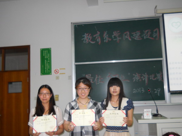 2013年5月29日下午4点30分,教育系“最佳自习生”主题演讲比赛在日阶105顺利召开,本次演讲比赛也是教育系5月学风建设月的系列活动之一。教育系、心理系联合党总支书记沈晓燕,副书记邵海波,教育系团总支书记朱可以及教育系12级各班正副辅导员出席比赛。 教育系12个2012级的班级代表,以极富班级特色及个人感情的方式,展现了教育系自习生的良好形象。最终2012级小教1班、2012级学前5班、2012级艺教4班分别荣获一、二、三等奖。他们的演讲不仅表达了对早晚自习活动的理解和支持,也表达出对班助理、辅导员的爱戴。(教育系) |