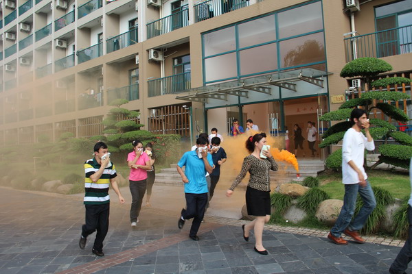 2013年5月24日早上7:00,学保处组织一号和三号公寓学生进行消防疏散演练。