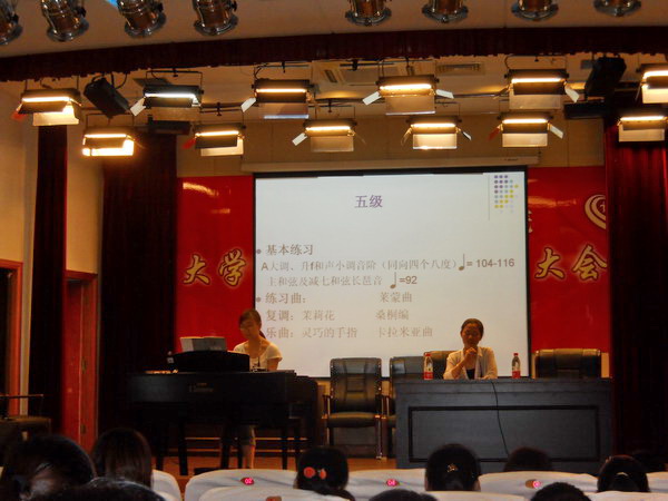 2013年5月21日下午,教育系在明华楼五楼报告厅举办了上海音乐学院钢琴四、五级考级指导讲座。此次讲座由钢琴老师田剑玫、朱小�主讲。 田剑玫老师首先介绍了上海音乐学院钢琴考级的特点,随后详细介绍了四级曲目需要注意的地方,包括指出了容易出错的点和细节,比如情感的把握、节奏与轻重的掌控、还有识谱中会遇到的一些问题。田老师亲自在钢琴上弹奏了每一首曲子,给同学们以最标准的示范。朱小�老师特别邀请她的一名学生来示范五级曲目,并深入浅出地讲解了曲目中的一些难点与重点,让同学们能更快更容易地掌握要领。两位老师的考级指导各有特色,但都细致入微、详细严谨。台下的同学们也都认真聆听,并不时拿出自己的考级书做笔记,及时发现和改正自己平时练习中的不足出错之处。通过指导,同学们收获颇丰,在提高了专业技能的同时,也进一步增强对钢琴演奏的兴趣。(教育系通讯员:吴晏婉) |