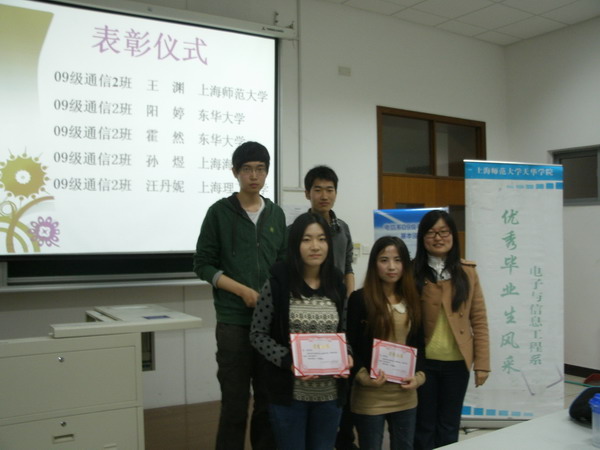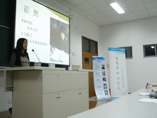 为响应学院“五月学风建设月”活动,2013年5月8日晚电信系于日阶405室组织召开了2009级考研经验交流会。电信系团总支书记金玫老师及2009级阳婷等四位2013年成功考研的优秀学子参加交流会。会议旨在为电信系2011-2012年级有意向考研的同学介绍优秀学子的考研经验及心得,为低年级学子考研做好充分准备。(金玫) |