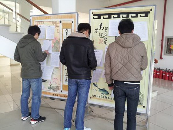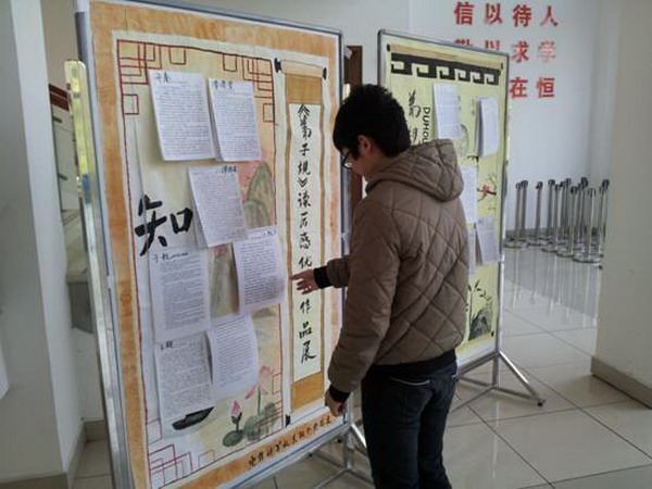 2012年12月4日,电信系、计算机系联合党总支在日华楼大厅进行“经典阅读―弟子规”为主题的优秀读书心得作品展,集中展示大一学生的24篇优秀作品,计算机系安排学生会学生对参观者进行了讲解。 为了弘扬中华民族传统文化,推进我院“专,通,雅”特色教学,电信、计算机系本学期在新生早自习中增设每周一天阅读经典内容,经过两个月“弟子规”的学习,电信、计算机系联合党总支在开展了工科系经典阅读朗诵比赛的基础上,进行了优秀读后感的评比活动,经过认真评选,从数百名大一学生作品中,挑选出了24篇优秀作品进行展示。这些作品中从不同角度诠释了大一新生对儒家经典与“专,通,雅”的深刻理解。(计算机系 李婉璐) |