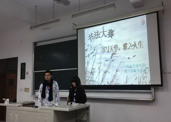 2012年11月19日下午,我院电信系学生会携手天华书法社在日阶104举办了一场主题为“书写天华,雅之人生”的书法大赛。本次比赛面向全校学生,分为硬笔书法和软笔书法两个项目,旨在展示天华学子的文学涵养并培养学子的高尚情操。比赛由电信系学生会秘书部部长冯梦雪担任主持。(电信系) |
