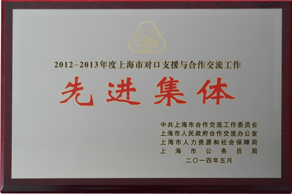 | 2014年5月9日上午,上海市委、市政府隆重举行全市对口支援与合作交流工作会议,我校获得了2012-2013年度对口支援与合作交流工作先进集体荣誉称号,是上海市教委系统唯一一家获得先进集体的单位,副校长朱国权代表学校上台领奖。 | ||