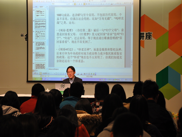 2014年3月23日下午,语言文化学院师生参加了嘉定图书馆承办的“名家论经典”中华传统经典系列普及讲座,活动特邀秋霞圃书院学术委员、博士生导师、复旦大学中文系教授郜元宝讲授作《致今人――活着的诗经》讲座。语言文化学院黄毅、虞琪君老师及来自各专业的40名学生参与其中。学生们在感受经典、与名家互动讨论的同时,亦为我校语言文化学院“经典育人”项目拉开序幕。 语言文化学院“走进经典,学做儒雅人”经典育人项目从2014年3月开始,通过“中华诵•诵读经典”、“中华梦•抒写经典”、“中华情•感悟经典”三大板块陆续展开,本次活动将通过名家讲读、大赛活动、读书分享、视频宣传等多种形式展开。 此次语言文化学院“经典育人”项目的开展,将为学生搭建一个“走进经典”的平台,通过精读经典,学做现代儒雅人创建儒雅校园文化,提升语言文化学院各专业学生的境界修养,在经典中品味知识的博大精深,在经典中培养修养的文雅得体,在经典中学做人处事的方法道理。(语言文化学院 虞琪君) |
