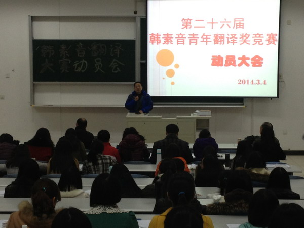 2014年3月4日,语言文化学院举行第二十六届“韩素音青年翻译奖”竞赛参赛动员大会,大会由语言文化学院万正方教授主持。 学校副校长、语言文化学院院长史文博士到会作动员报告,第二十四届英译汉全国第一名获得者黄蔚老师、第二十五届英译汉全国一等奖获得者邢�老师、第二十四届汉译英全国二等奖获得者施华琛同学和汉译英优秀奖获得者范德阳同学分别作了交流发言。最后教育与艺术学院副院长徐娟老师为大家作了精彩的第一堂参赛培训课。 |