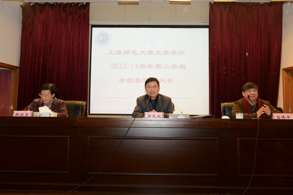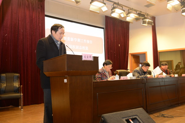 | 2014年2月14日上午9点,学校在明华楼五楼报告厅召开了2013-2014学年度第二学期全校教职工大会。总校监郭天成、校长石伟平、党委书记韩晓玉在主席台就座,全体党政领导干部和教职员工出席会议。总校监郭天成主持会议。 | ||