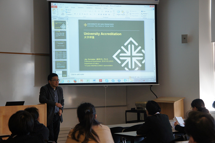 美国旧金山当地时间2014年1月21日上午,我校寒假高等教育赴美研修团在党委书记韩晓玉、副书记曹云林的带领下,前往美国加州旧金山大学(University of San Francisco)进行学习交流。旧金山大学政治系政府与政治学教授Jay Gonzalez博士为我们做了题为“大学评鉴”的讲座,具体包括评审的重要性、认证方法、认证标准、案例研究这四个板块。 |