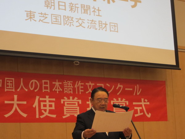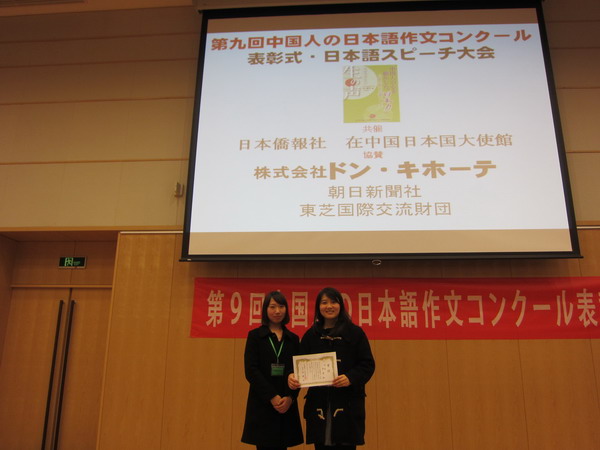 | 2013年12月12日,我校语言文化学院日语专业学生李灵及其指导教师张丽�出席了在北京・日本驻中国大使馆举行的第九回中国人日语作文比赛的颁奖仪式。此项大赛由日本侨报社・日中交流研究所主办,大赛题目为“中国人述说在日本的感动”,共设有特等奖1名,一等奖5名,二等奖15名,三等奖40名。李灵同学的作文从全国近3000篇作文中脱颖而出,获得了二等奖。日本驻华大使木寺昌人也应邀出席了本次颁奖仪式并致辞。(语言文化学院) | ||