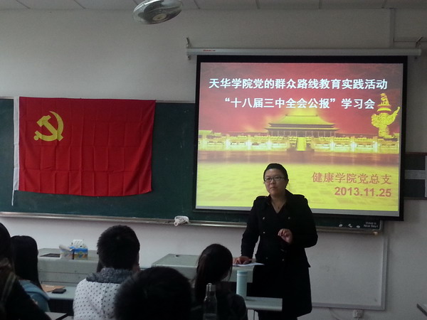 2013年11月25日,健康学院党总支召开了“党的群众路线教育实践活动之十八届三中全会公报学习会”。党总支书记孙超、党总支副书记周建光,党支部书记黄璐以及全体教师、学生党员,预备党员和入党积极分子参加了本次活动。 本次学习会主要对“十八届三中全会公报”进行解读,了解公报的涵义、内容,开展小组讨论。教师代表代维祝和学生代表范圳莉就个人对于“三中全会”重点问题的关注和理解开展了热烈的交流并分享了各组的心得体会。 最后,党总支书记孙超强调了本次学习会的重要性,并总结了党总支自2013年9月份以来开展的各项“群众路线教育实践活动”,要求教师党员、学生党员不断提高对自己的要求和标准,进行自我剖析,发现问题,解决问题,教师在工作中要以“爱学生”为宗旨,学生党员和积极分子要发挥先进性和模范性,真正发挥凝聚力。 |
