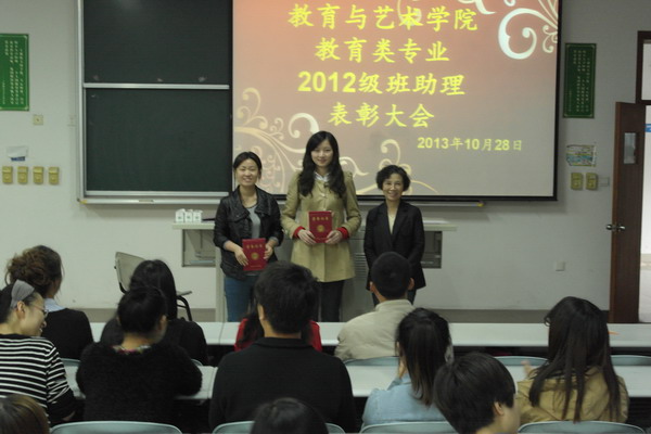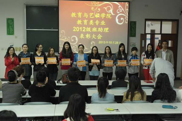 2013年10月28日16:30,教育专业党总支举行2012级优秀优良班助理表彰大会,学校党委书记助理凌琦、教育类专业党总支书记沈晓燕、党总支副书记刘洪伟,艺术教育专业学生党支部书记吴启源、党支部副书记沈洁以及辅导员老师们参加大会。 会议向教育与艺术学院教育专业2012-2013年度“优秀、优良班助理”颁发了荣誉证书。党委书记助理凌琦发表讲话,对班助理付出的努力表示赞扬与肯定,希望班助理们继续努力,鼓励老师和班助理们能够齐心协力,共创新生工作的良好风貌。12级班助理代表房晴川和13级新生班助理代表陆凯文交流发言。 |