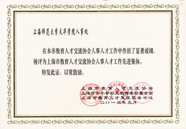 | 2013年3月22日,上海市教育人才交流协会2013年年会在上海师范大学召开,会上,我院人事处获得人事人才工作先进集体称号。 | ||