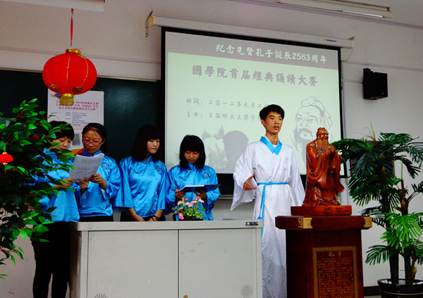 | 2012年9月28日是至圣先师孔子诞辰2563周年纪念日,国学院在月华楼368室举办了“首届经典诵读大赛”决赛,以此缅怀孔子。 | ||