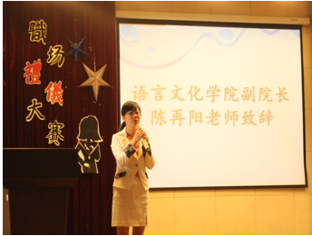 2015年5月7日下午4时30分,上海师范大学天华学院报告厅举行了语言文化学院第二届职场礼仪大赛决赛。担任本次大赛的评委有语言文化学院常务副院长陈再阳老师、党总支常务副书记蔡勇永老师、语言文化学院分团委书记杨央老师、德语专业主任傅夷清老师、德语专业党支部书记曹占侠老师,英语专业党支部副书记李江涛老师、汉语言文学专业党支部书记刘庆奇老师以及辅导员李臻老师和高德翔老师。