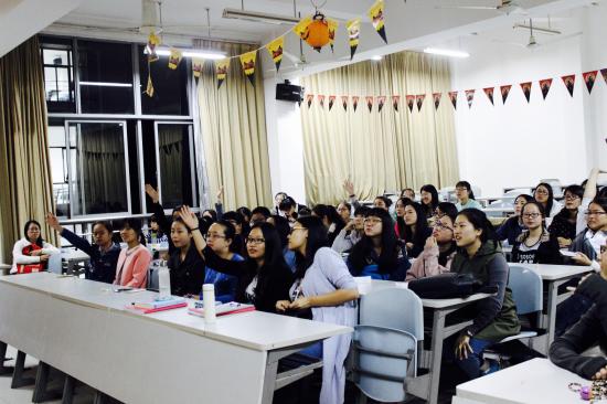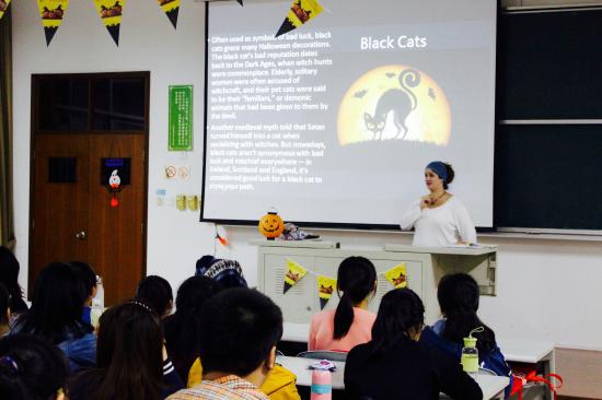 2015年10月28日周三下午16:30,天华学院英语角之万圣节主题活动准时在日阶303教室举行。本次活动由我校国际交流处主办,语言文化学院分团委学生会承办。天华学院的两位美国外教与五十名同学如约而至,共同参与了一场具有万圣节特色的活动。