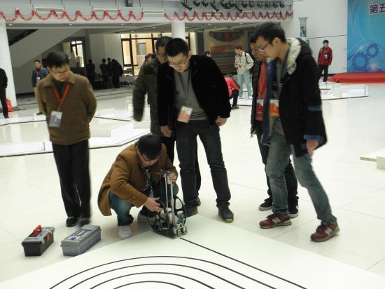 此次比赛作为全国赛的预选赛,同时也为探索大学生工程训练综合竞赛模式改革,首次采取了机电结合的形式。竞赛分为螺旋型循迹常规赛、“S”型避障常规赛和多边形综合挑战赛三个项目。要求参赛队自主设计、制作一辆“自动识别三轮无碳小车”,小车动力由1kg砝码从400mm的高度降落的重力势能提供,前轮转向由舵机与传感器组成的电控装置实现,完成相应轨迹的行走。