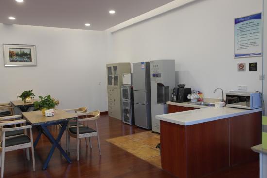 茶水室目前配置咖啡桌椅16张、操作台1张、咖啡机、微波炉、净水机、冰箱、毛巾消毒柜和茶具消毒柜,配套提供有热毛巾、现磨咖啡和速溶咖啡、茶叶、点心,同时为了规范教师休息室的管理,最大化发挥休息室的功能,学校专门制定了《教师休息室管理制度》和禁烟、无线网络全覆盖提示牌悬挂上墙。