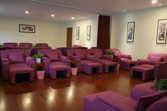 休息室东部为男女教师隔开的休息区域,目前配置沙发20套,茶几10套,该沙发具有电动调节功能,可坐立、半躺、平躺随意调节。休息室三面墙壁悬挂有八幅苏州手工刺绣画作,用于烘托休息室温馨优雅之氛围。另外,考虑到老师休息时要脱鞋,为此我们专门在外面走廊放置了两个鞋柜,老师进来休息室要换鞋并穿好鞋套后方可入内。