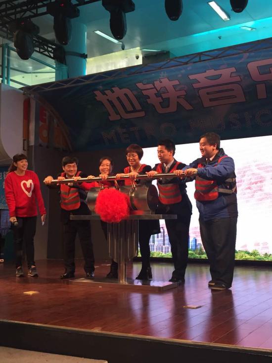 (韩聪颖老师等五名志愿者代表共同推杆“开启”地铁“雷锋号”列车)